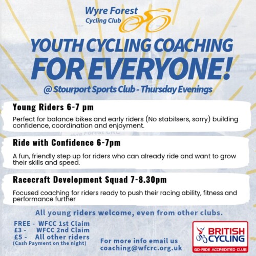 Our full programme of youth cycling sessions is back — from first pedals to full Racecraft. All young riders are welcome, even if you’re from another club. Young Riders — 6–7 pm Perfect for balance bike and early riders (No Stabilisers) building confidence, coordination and enjoyment through fun games and gentle challenges. Ride with Confidence — 6–7 pm A fun, friendly step up for riders who can already ride and want to grow their skills, speed and…